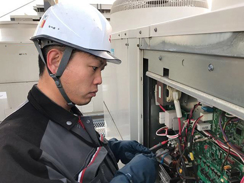 商業施設や病院などに設置されている業務用エアコンの点検や修理が主な仕事です。エアフィルターの清掃や、繊細さを要する部品の取替、火気を使用する溶接作業など、仕事の内容は多種多様です。この仕事には技術・技能・経験・忍耐力が必要です。さらに、お客様との対話が重要であり、話術も備えなければなりません。その為、一人前になるには時間が掛かります。しんどい時もありますが、一つ一つの作業に達成感があり、自分を高められる仕事だと思っています。