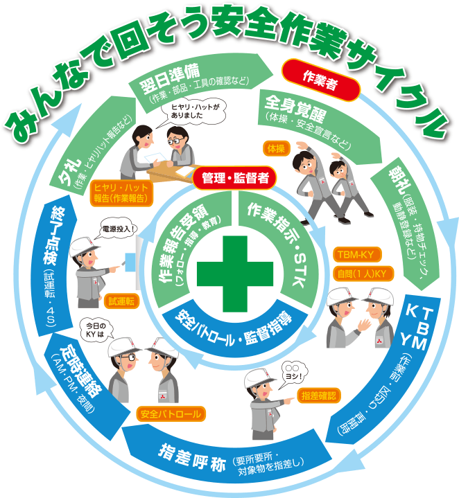 安全作業の基本は「決められた安全ルールや作業手順を遵守する」こと、安全作業サイクルをしっかりと回し、一日の作業(体操・朝礼~作業~報告)を進めます