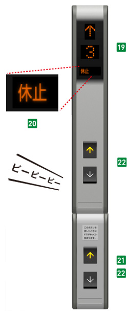 エレベーターが運転休止すると休止灯が点灯。 また、乗場ボタンを押すとアラーム音が鳴り、エレベーターが使用できないことをお知らせします。