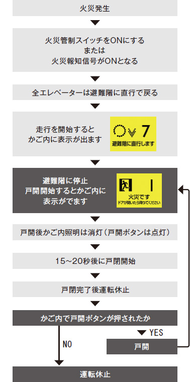 万が一、火災が発生した場合、エレベーターを避難階へ直行させ、乗客の迅速な避難を促し、閉込めを防ぎます。また災害時のエレベーターの運転を休止し、二次災害を防止します。