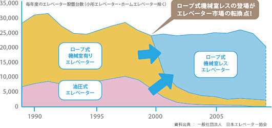 グラフを見てもわかるように、1999年のロープ式機械室レス・エレベーターの登場を機に、エレベーターの主流が一気に移行しました。ロープ式機械室レスが増えつづける一方で、油圧式の設置台数はどんどん減少。低速エレベーターの9割弱が、ロープ式機械室レスとなってきています。
