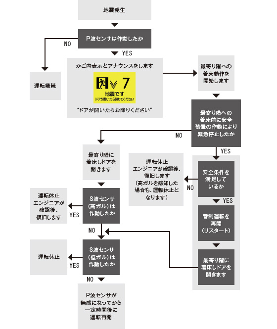 P波センサ付地震時管制運転(3段設定・リスタート機能付)*地震の初期微動(P波)をセンサが感知、最寄り階に着床してドアを開きます。さらに、地震時管制運転中に他の安全装置が作動して階間で停止した場合に備えて、リスタート機能も標準装備。安全装置が復帰し、安全であることが確認されれば管制運転を再開。最寄り階に着床してドアを開きます。閉込めを最小限にする安心の機能です。