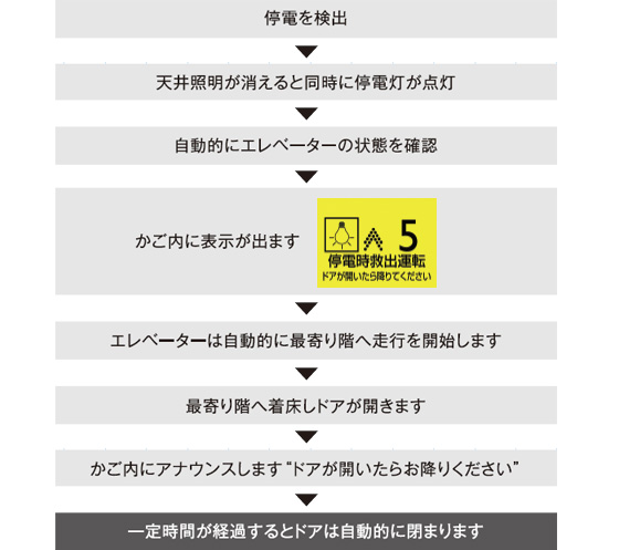 停電時自動着床装置*停電などでエレベーターの中に人が閉じ込められた場合、自動的にエレベーターの状態を確認し、バッテリーですみやかに最寄り階へエレベーターを着床させます。
