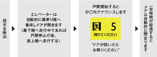 冠水時管制運転ピットに一定以上の深さまで冠水した場合、最寄り階まで自動的に走行してドアを開いた後、エレベーターを休止します。