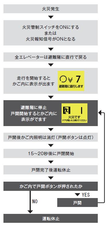 万が一、火災が発生した場合、エレベーターを避難階へ直行させ、乗客の迅速な避難を促し、閉込めを防ぎます。 また災害時のエレベーターの運転を休止し、二次災害を防止します。