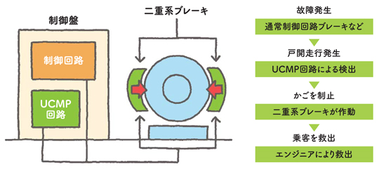 駆動装置や制御機器が故障状態となり、かごおよび昇降路のすべてに出入り口のドアが閉じる前にエレベーターが昇降した場合、自動的にエレベーターを制止させる機能。<Elemotion+R(エレモーション・プラス・アール)>は、新安全基準に対応した戸開走行保護装置を標準装備。UCMP回路と非常止め装置との連携で、万が一の故障時には、安全をしっかり守ります。