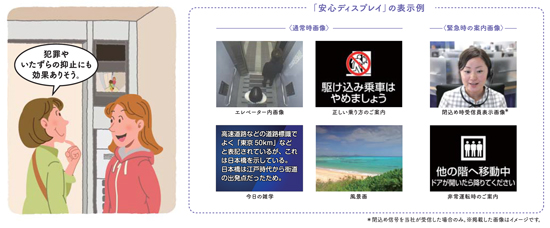 また、通常時には犯罪・いたずらの防止に効果的なエレベーター内カメラの映像や、風景画、今日の雑学などを表示します。