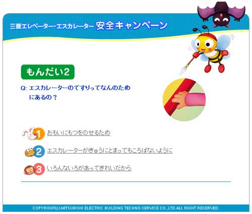さらに、「みんなでまもろうね!エスカレーターのただしいのりかた」をはじめとしたリーフレットを配布したり、キャンペーン開催地以外のお子様にもエレベーター・エスカレーターの安全な乗り方を学んでいただくために、Webサイトを使ったキャンペーンも展開しています。「Web版安全キャンペーン」では、リーフレットのダウンロードのほか、デジタル紙芝居やクイズなどを通じて安全な乗りかたを説明しています。