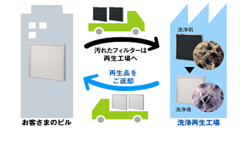 お客様がご使用した汚れたフィルターを回収し、洗浄再生可能なフィルターを取り付けた後、回収したフィルターを洗浄工場にて洗浄し、ふたたびお客さまのビルに搬送します。
