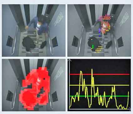 エレベーター内のカメラで撮影した画像を4,800コマに分割、各コマに映っている人の動きの「向き」と「大きさ」を解析することで、暴漢によるトラブルなどを検出します。