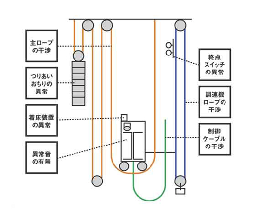 確認後、微速走行・低速走行・通常走行、スピードを段階的に上げながら異常の有無を診断。戸開閉診断の後、自動診断運転を終了します。
