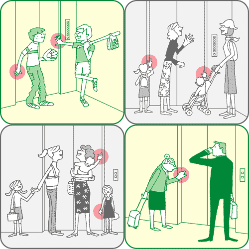 エレベーターのドアに寄りかかったり、手をついたりしたままドアが開くと、隙間(戸袋)に手が引き込まれる恐れがあります。特に、子どもの手は小さくて柔らかいため、誤って引き込まれることがないよう十分な注意が必要です。