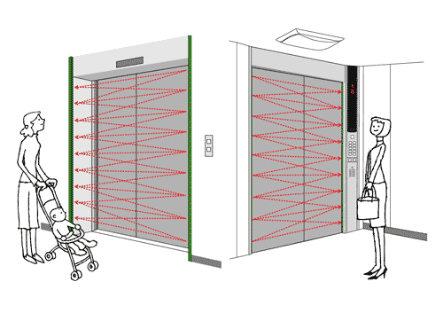 「ドア・アラームW」は、エレベーターの乗場側・かご側のドア付近に複数の赤外線ビームを張り巡らしたセンサを設置し、赤外線ビームがさえぎられた場合に人の手など体の一部がドアに触れている可能性があると判断します。エレベーターのドアが開く前にセンサが感知状態になるとドアが開くことを自動アナウンスします。さらにドアが開く直前になってもセンサ感知状態が継続している場合は、ドアの開きはじめを遅らせて、アナウンスとブザーでドアから離れるように強く警告します。