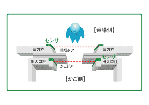 マルチビーム赤外線センサ(ビーム数:最大194本)を乗場側、かご側の両側に設置 |