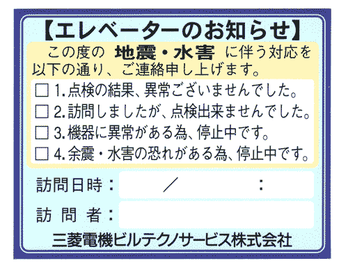 “ビルを、まるごと、心地よくする”-三菱電機ビルテクノサービス株式会社(本社:東京都、取締役社長:岡部 季生)では、地震や水害で停止したエレベーターの緊急点検・復旧作業結果をビル管理者等へ直接報告できない場合に、いつ、誰が対応し、その結果がどうであったかという情報をお知らせする表示ラベルを導入します。このラベルは、エレベーター乗場付近等の目に付きやすい箇所へ貼り付け、「点検の結果異常が無かった」「機器に異常があり停止中」「訪問したが点検できなかった」等の結果をビル管理者や利用者へ正確・迅速に提供することが可能です。
