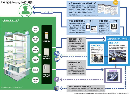 当社のビル遠隔管理サービス「メルセントリー」は、お客様のビルの受変電設備や給排水設備、冷凍・空調設備、防犯カメラシステムなどの設備機器が正常に稼働しているかを、常時当社情報センターにて遠隔監視し、万一異常信号を受信した場合は専門のエンジニアが出動して迅速に復旧を行うサービスです。