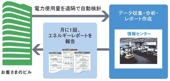 お客様ビルの電力使用量を遠隔で自動検針し、月1回「エネルギーレポート」を作成し、報告します。「エネルギーレポート」には、月毎・日毎・時間毎の電力使用量などとあわせて、分析コメントも記載。省エネ対策に向けたアドバイスをご提供します。
