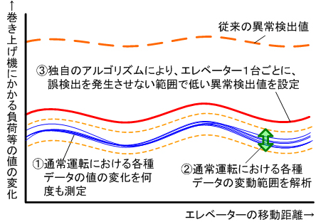 ◇異常検出値を緻密に設定する技術の開発 :独自のアルゴリズムで個々のエレベーターに最適な異常検出値を設定
