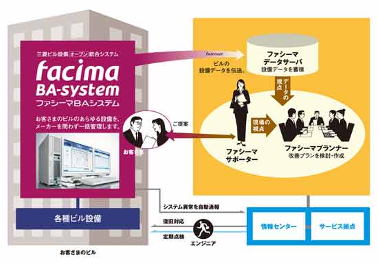 「Facima BA-system」によって、ビルの様々な設備(空調・照明・受変電・セキュリティー設備等)の「データ」を収集し、三菱電機ビルテクノサービスの「ファシーマデータサーバ」に伝送・蓄積します。
