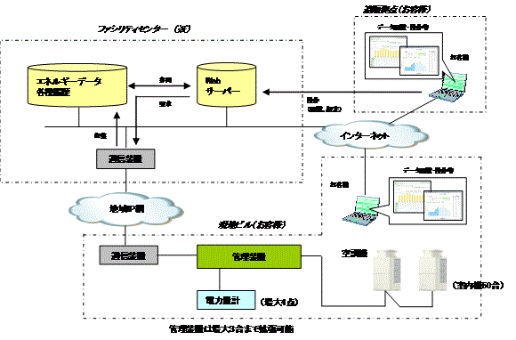 ・管理装置により収集したデータを当社ファシリティセンターのサーバー に格納し、インターネット経由でお客様のパソコンにて閲覧が可能 ・現在の電力量、空調機運転データと過去のデータを比較可能 ・複数拠点のデータを一元管理可能(データ閲覧、計測データの一括 集計・管理 |
