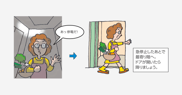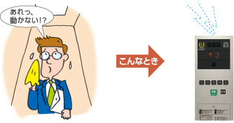 停電などでエレベーターの中に人が閉じ込められた場合、自動的にエレベーターの状態を確認し、バッテリーでエレベーターをすみやかに下方の最寄り階へ着床させます。