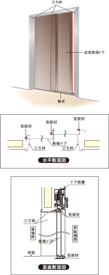 *:2000年6月に施行された改正建築基準法により、エレベーターの昇降路の防火区画に「遮煙性能」を有する防火設備の設置が義務づけられました。