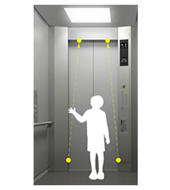 かご内の戸袋に近づく人の手や荷物などを感知して、ドアの開く速度を減速。 また戸開動作中にセンサが感知するといったんドアを停止させ、その後ゆっくりと開きます。