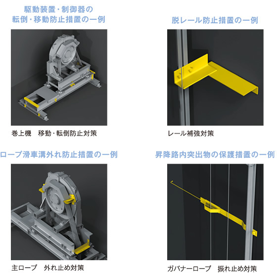 エレベーターの耐震対策は、建物の構造やエレベーターの設置方法によって、大きく異なります。 1台1台の据付け状況等を実測・確認することで、レールの支持材の補強、巻上機などの移動転倒防止等を行ない、エレベーター機器の耐震性を強化します。