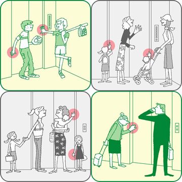 | 「ドア・アラームW」は乗場・かごの両側に設置した複数の赤外線ビームセンサが、戸開時に人の手などを検出。 ドアから離れるようにアナウンスで注意します。さらにドアが開く直前の場合には戸開のタイミングを遅らせ、ブザーで強く警告。 かごの到着を待つ人やかご内の乗客の手などのドアの隙間(戸袋)への引き込まれから守ります。 |