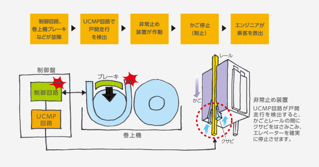 駆動装置や制御機器が故障状態となり、かごおよび昇降路のすべての出入口のドアが閉じる前にエレベーターが下降した場合、自動的にエレベーターを制止させる機能。<エレモーション・プラス>は、新安全基準に対応した戸開走行保護装置を標準装備。UCMP回路と非常止め装置との連携で、万が一の故障時には、安全をしっかり守ります。