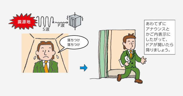 大きく揺れる本震(S波)の前に到達すつ地震の初期微動(P波)をセンサが感知。進行方向の最寄り階へ避難運転を開始します。一定以上の大きな揺れの場合、避難運転後は休止状態となり、エンジニアが安全であることを確認したあとに復旧します。