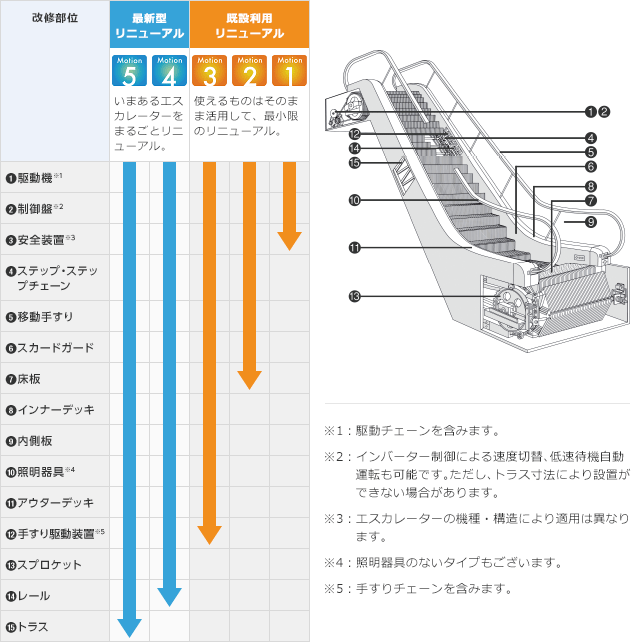 いま稼働中のお客さまのエスカレーター、設置されてから何年たちますか?長年使用されたエスカレーターは、適切なメンテナンスをしていても、経年による機能劣化は避けられません。故障時の部品調達が難しくなり、修理時間(停止時間)が長くなることもあります。さらに、エスカレーターに求められる機能や法改正による安全基準も年々変化しています。この先も安心してご利用いただくために、エスカレーターにも適切な時期でのリニューアルが必要です。そこでおすすめするのが、先進のエスカレーターリニューアル〈エスモーション〉。もっと安心・安全に。もっと省エネに。もっと快適に。お客さまのご要望に合わせたリニューアルを実現します。ぜひご検討ください。